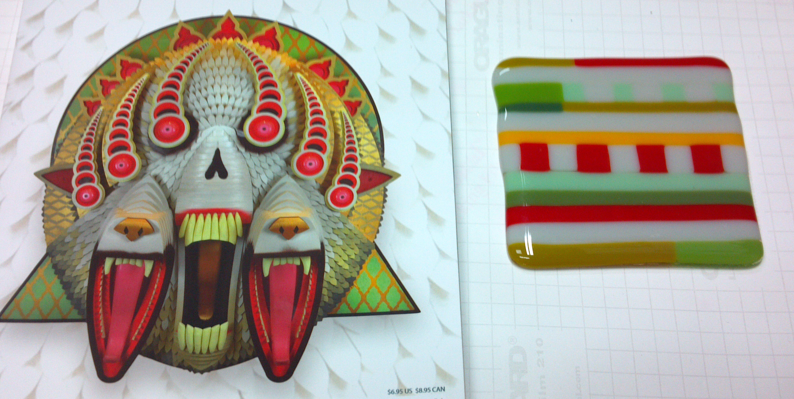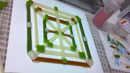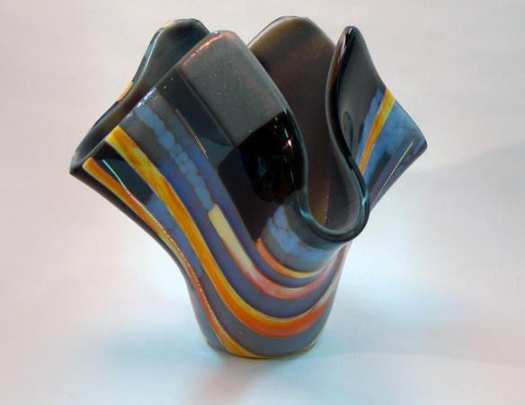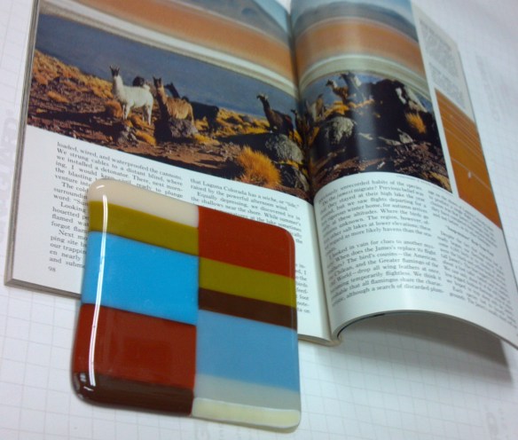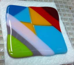 (Note: I accidently flipped the blue and yellow tiles in the natural lighting one. The blue one is in the middle in the other photos. So the blue tile is the one that glows the most.) This fused glass triptych will be fore sale at the gallery, the whole set is $650.00, or $250.00/ea. Each tile is approximately 6″X14.” Displaying them all together takes up about 20″X14″ of space, that is including an inch spacing in between each one.