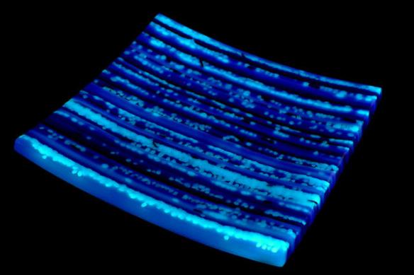 This is my second year taking part in the Iron Fuser Competition at Helios Kiln Glass Studio in Austin, Texas. For the past three years Helios has put this annual juried glass art competition together which has had entrants from all around the United States. The title “Iron Fuser” is a spoof on Iron Chef, seeing that we “cook” glass and are given main ingredients that must be used in creating a piece of art. This year the special ingredients were a sheet of neo-lavender tint, a sheet of custom blue streaky, 6″ of copper wire, and the coolest ingredient of all, glow in the dark frit!